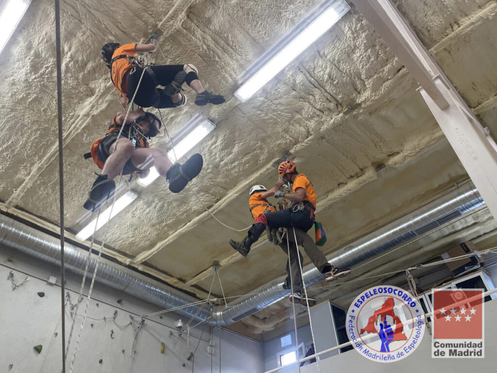 Este mes de Junio hemos vuelto a repasar en el rocódromo los contrapesos encadenados, incorporando esta vez un paso de nudos a uno de ellos, para finalizar la concatenación en un soporte, rematado con un balanceo controlado.